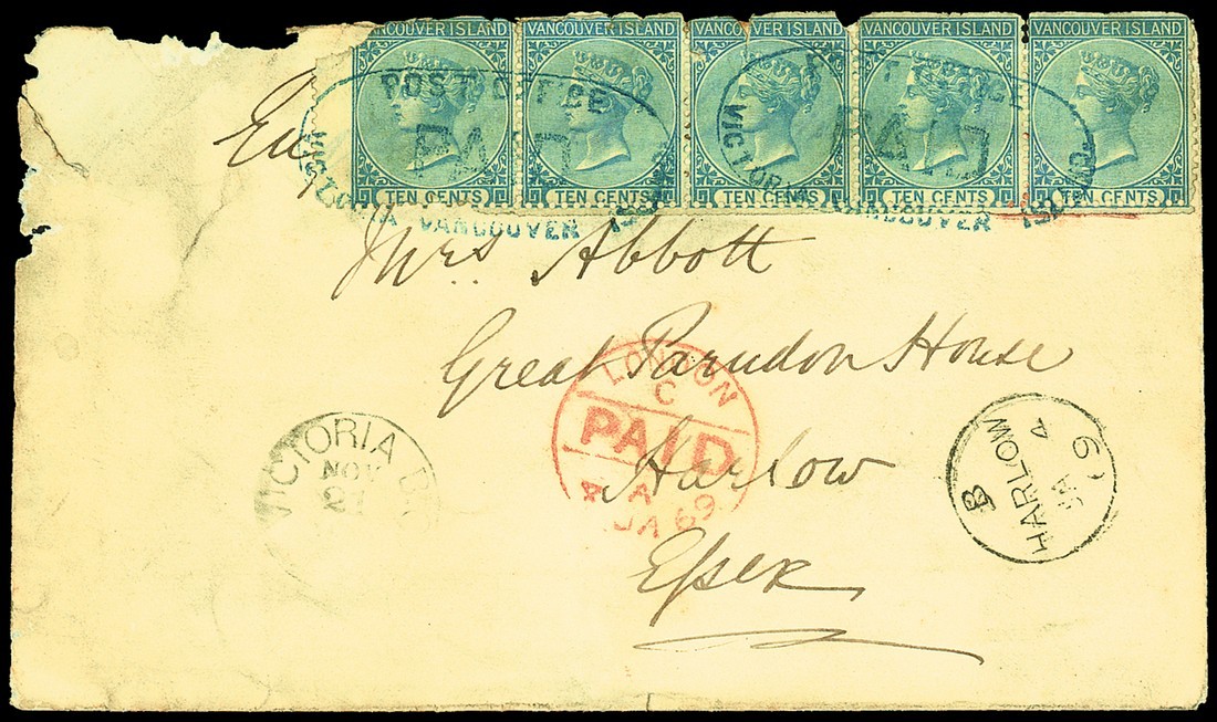 1868 (21 Nov.) Vancouver Island envelope to England, bearing 1865 perf. 14 5c. blue strip of five tied by two post office/paid/vancouver island cancellations in blue, alongside London Paid in red, despatch and arrival datestamps; faults though an exceptional franking; British Columbia envelope to England bearing 1868-71 perf. 14 25c. and another envelope franked 5c. with another stamp cut away. Photo for first