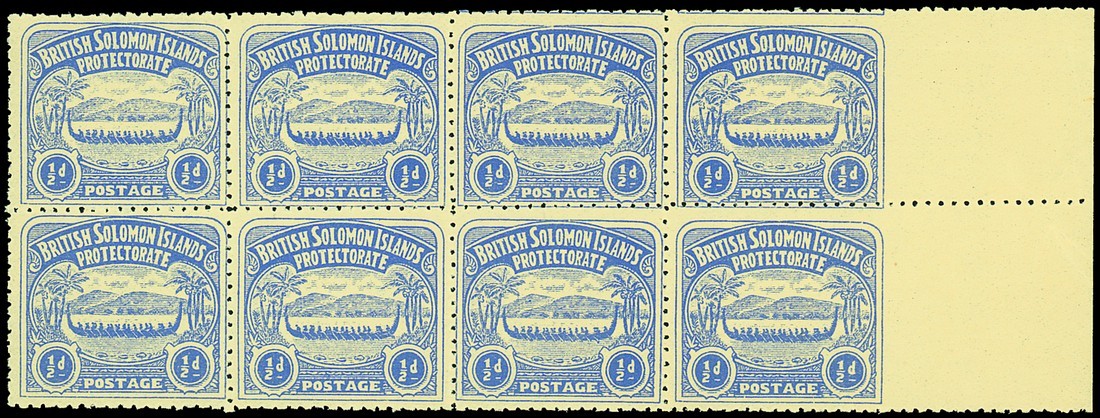 1907 Large Canoe ½d. ultramarine marginal block of eight (4x2) from the right of the sheet, variety imperforate between stamps and margin; some light mainly marginal creases, otherwise fine unused with large part original gum. S.G. 1. Photo
