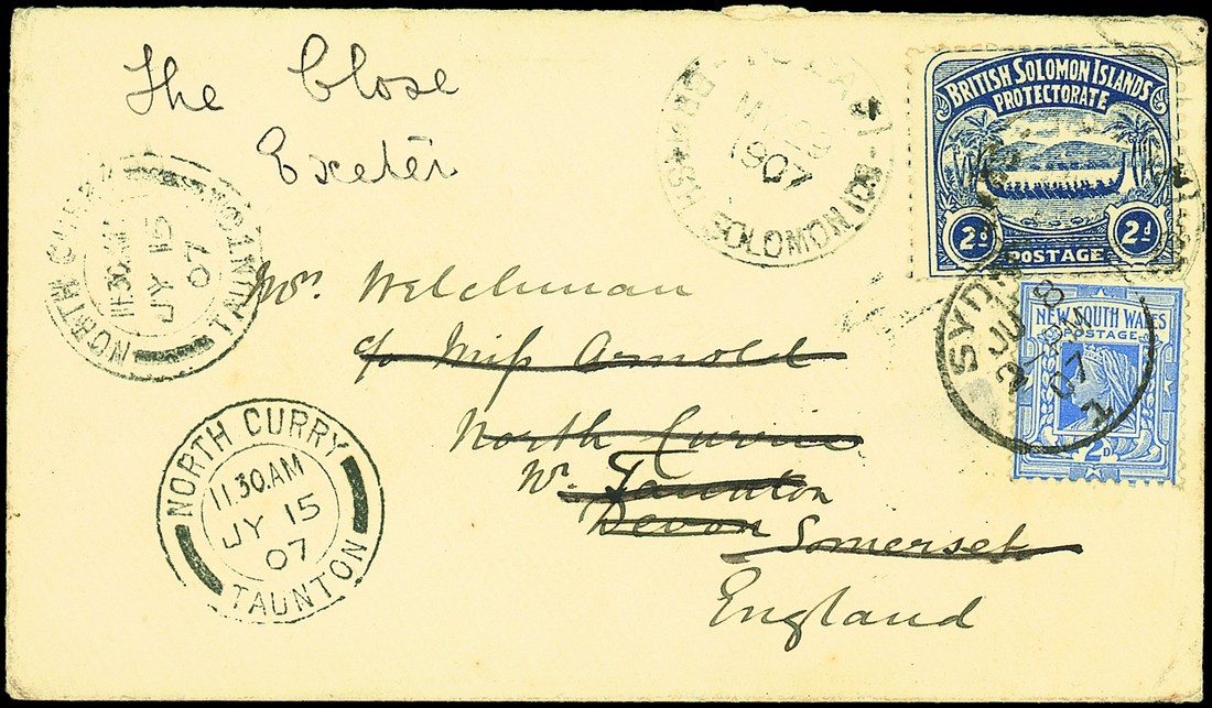 1907 (29 May) envelope to Somerset and redirected locally, bearing 1907 Large Canoe 2d. tied by light Tulagi c.d.s. with another strike alongside, in combination with N.S.W. 2d. tied by Sydney c.d.s. (8.6) and additionally tying the Canoe 2d., two arrival datestamps (15.7) at left. A very rare and previously unrecorded cover of which very few are known. Photo