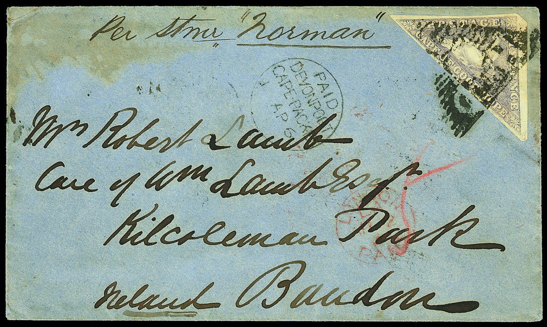 1860 (21 Feb.) envelope from Cape Town "Per Stmr. Norman" to Baudon, bearing 6d. rose-lilac with good to large margins and clearly cancelled, showing manuscript "5" in red crayon and Paid Devonport Cape Packet c.d.s. (1.4), the reverse with Cape Town, Cork and arrival (3.4) c.d.s.; the envelope a little stained at top, otherwise sound. Photo