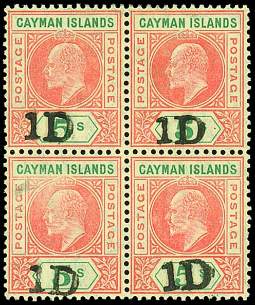 1907 (Nov.) "1d" on 5/- salmon and green block of four, unused with large part original gum, the lower left stamp with slight surface rubbing, otherwise fine. A scarce multiple. S.G. 19, £1,100. Photo