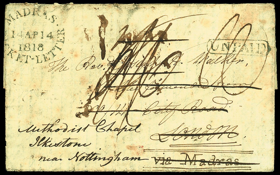 1818 (23 Feb.) entire letter from Negombo to London, marked "via Madras" and redirected to Nottingham, rated "3/6" with good strikes of "madras/packet letter" datestamp (14.4) and framed "unpaid", the flap bearing two London datestamps (11.9); somewhat soiled. The contents are a long and detailed letter from a missionary. Photo