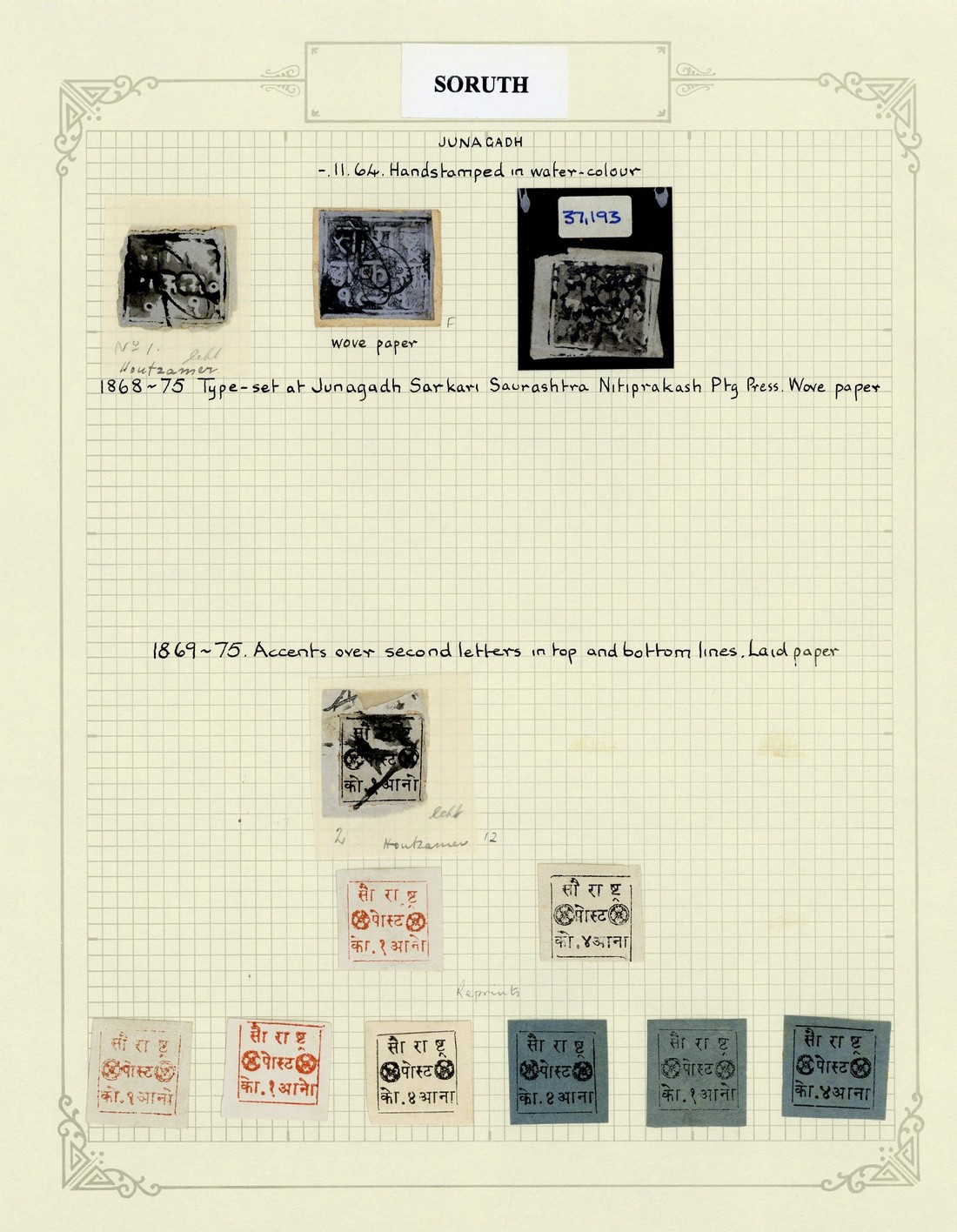 1864-1949 collection, the unused/mint include 1875 1a. red on white, 1878-1929 selection, 1929 set and Officials complete, United State of Saurashtra set of three and Official 1949 3p. (light crease) and 1a. on 2a.; the used with 1864 (1a.) black on azure (2, one on laid paper), 1878-1929 range, 1929 set and Officials complete, United State of Saurashtra set of three and Official set of ten; generally good to fine. B.P.A. Certificate for one 1864 (1a.)