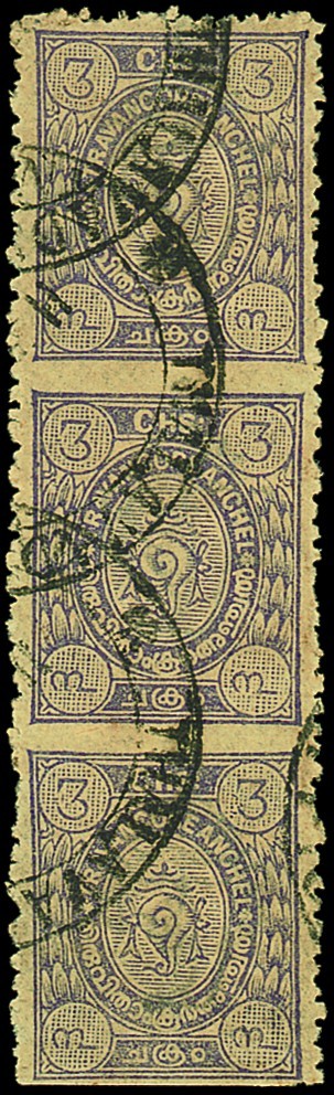1904-20 3ch. violet vertical strip of three, variety imperforate between and at foot, several part Thalavad c.d.s.; top stamp with a horizontal crease, otherwise fine. Scarce. S.G. 17b, £425. Photo