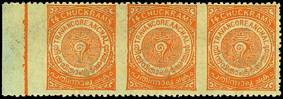 — 14ch. orange-yellow marginal strip of three from the left of the sheet, variety imperforate vertically except at right, fresh with large part original gum; scarce. S.G. 20a, £600. Photo