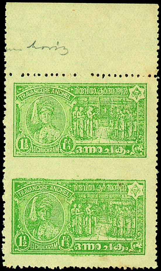 1937 Proclamation 1½ch. yellow-green vertical marginal pair from the top of the sheet, variety imperforate between, part original gum; a few tiny brown spots which just show through to face in a couple of places. Scarce. S.G. 62a, £500. Photo