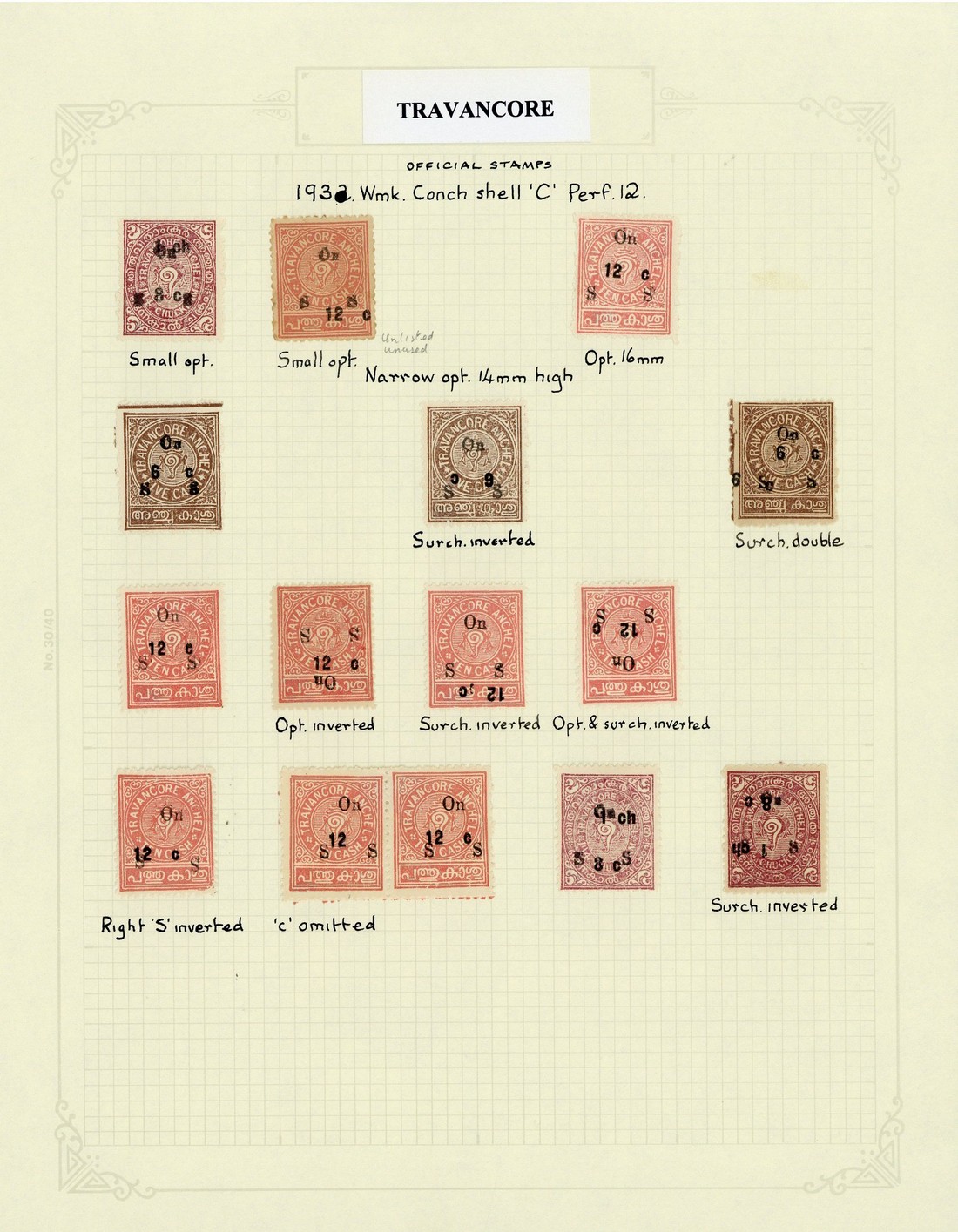 1932 Surcharges unused selection (43) with a range of varieties including surcharges and overprints inverted, inverted letters, and watermark C 12c. on 10ca. pair with one showing "c" omitted; generally fine