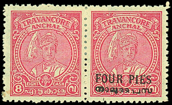 4p. on 8ca. perf. 12 horizontal pair, the left-hand stamp with variety surcharge omitted, large part original gum; minor crease at foot. Scarce. S.G. 2db, £275. Photo