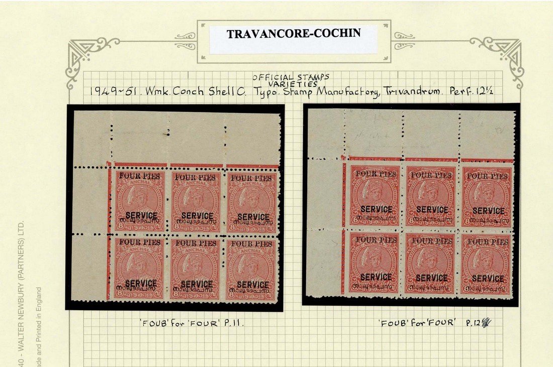 — 4p. on 8a. carmine, perf. 11 and perf. 12 upper left corner unused blocks of six with the lower right corner stamp in each showing "foub" error; fine. S.G. O2ba, ca, £300