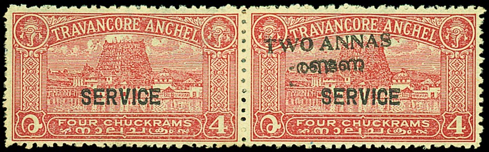 — 2a. on 4ch red horizontal pair, the left-hand stamp without surcharge, unused; some creasing, possibly the cause of the error. Scarce. S.G. O5cb, £450. Photo