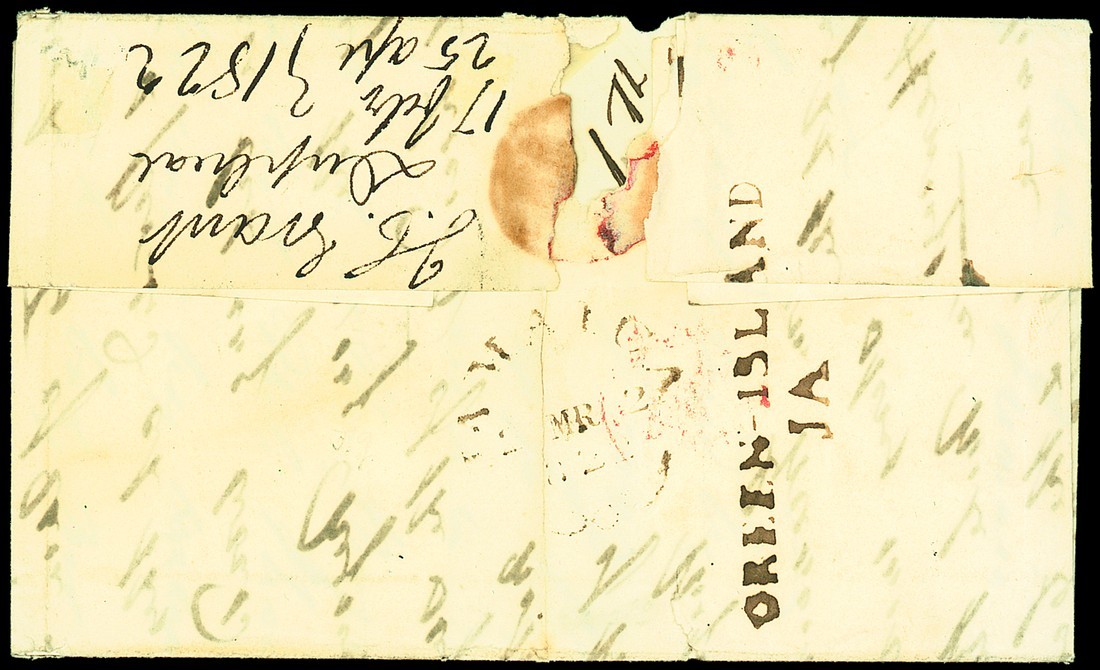 1822 (Mar.) entire "p Marchioness Queensbury Packet" to Scotland, rated "4/10" and showing, on reverse across join, fine "green island/ja" (T3 rated R) alongside Jamaica fleuron datestamp (F5). Photo