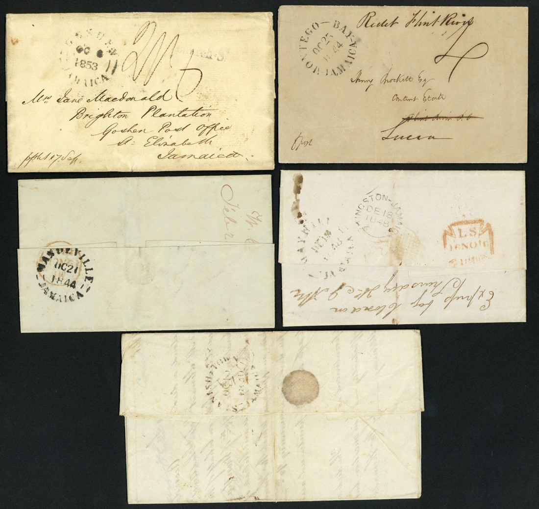 1840-53 entire/entire letters (two incoming) showing double-arc datestamps of Falmouth, Goshen, Mandeville, Mayhill, Montego Bay and Spanish Town, fair to fine strikes; also 1856 part entire from Kingston to Porus with arrival c.d.s.