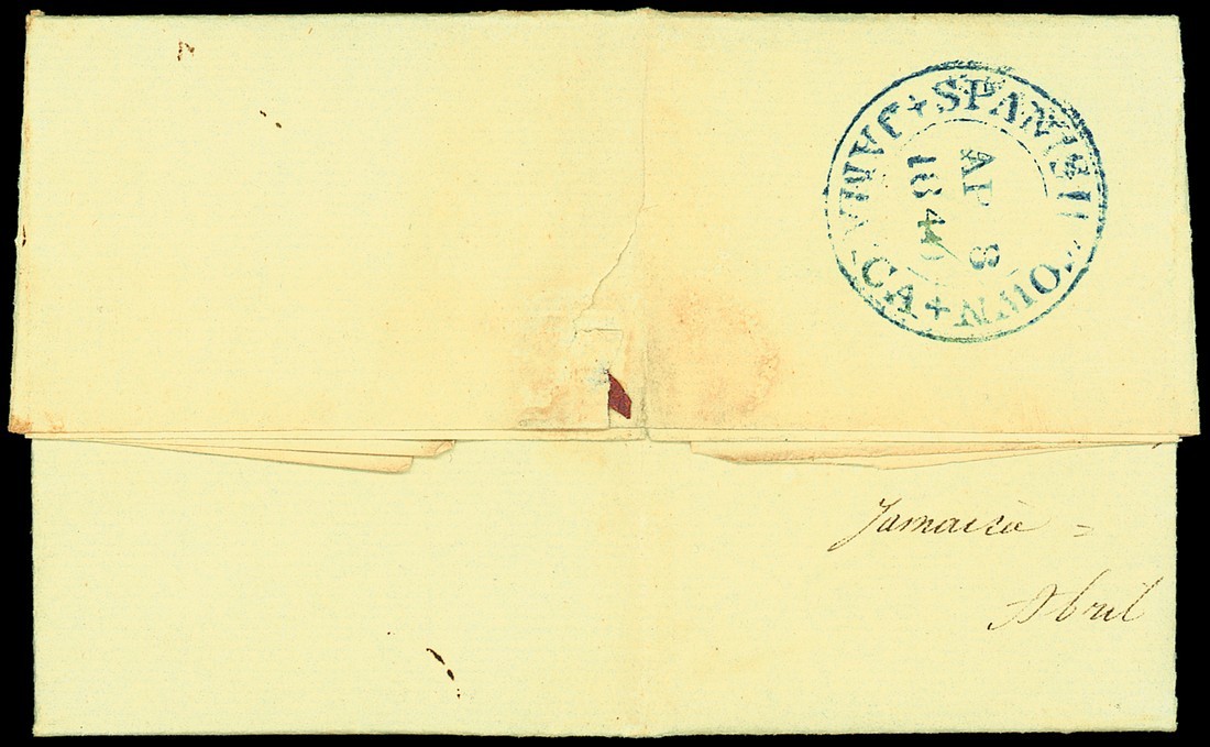 1840 (8 Apr.) entire letter written from "King's House" on behalf of the Governor of Jamaica, to the Spanish Consul at Kingston showing, on reverse, a fine "spanish town/jamaica" c.d.s. (P1) in blue; very rare with only one example recorded by Foster and with only two others from the Fitzherbert correspondence known. Photo