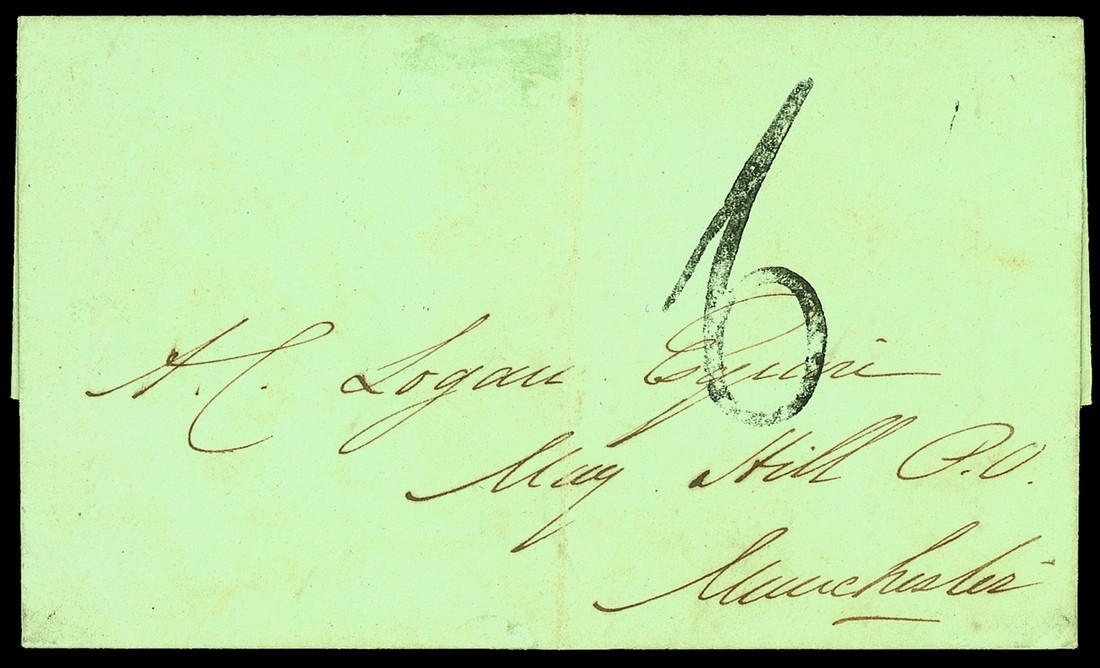 1845 (19 June) entire letter from Kingston to May Hill Post Office, sent unpaid and showing fine strike of the large "6" to pay handstamp (TP1), despatch c.d.s. on reverse. Photo
