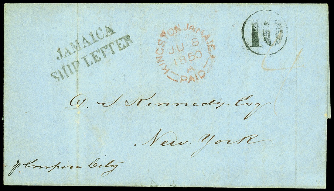 1850 (8 June) entire "p Empire City" to New York, rated "4" and showing fine "jamaica/ship letter" (SL1, crossed by light filing crease), Kingston c.d.s. in red and circular-framed "10" (due). Photo