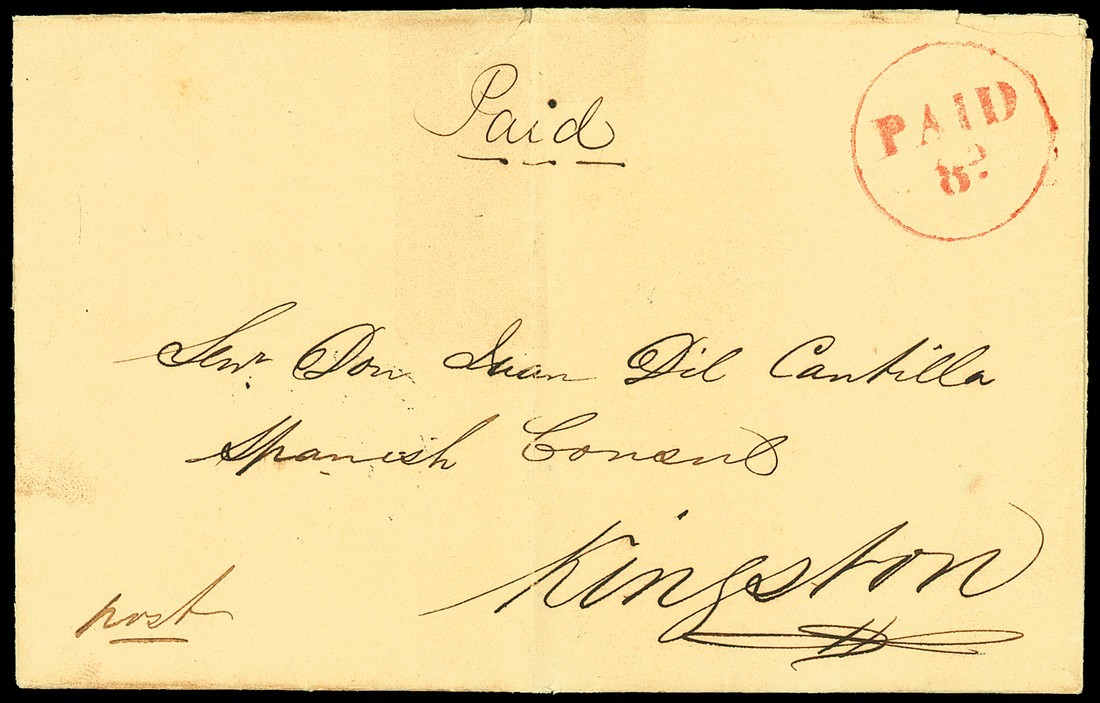 1852 (12 Aug.) entire letter from Montego Bay to the Spanish Consul in Kingston, showing a fine strike of the circular-framed "paid/8d." handstamp (PD14) in red, despatch and arrival (14.8) c.d.s. on reverse; small faults though of fine appearance though a rare handstamp. Photo