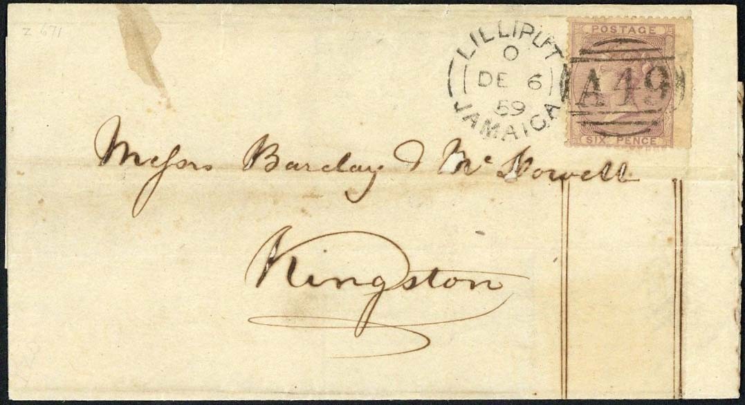 1859 (6 Dec.) entire (partially separated at folds) from Lilliput to Kingston, bearing G.B. wing-margin 6d. lilac cancelled by fine "A49" duplex, arrival c.d.s. (7.12) on reverse