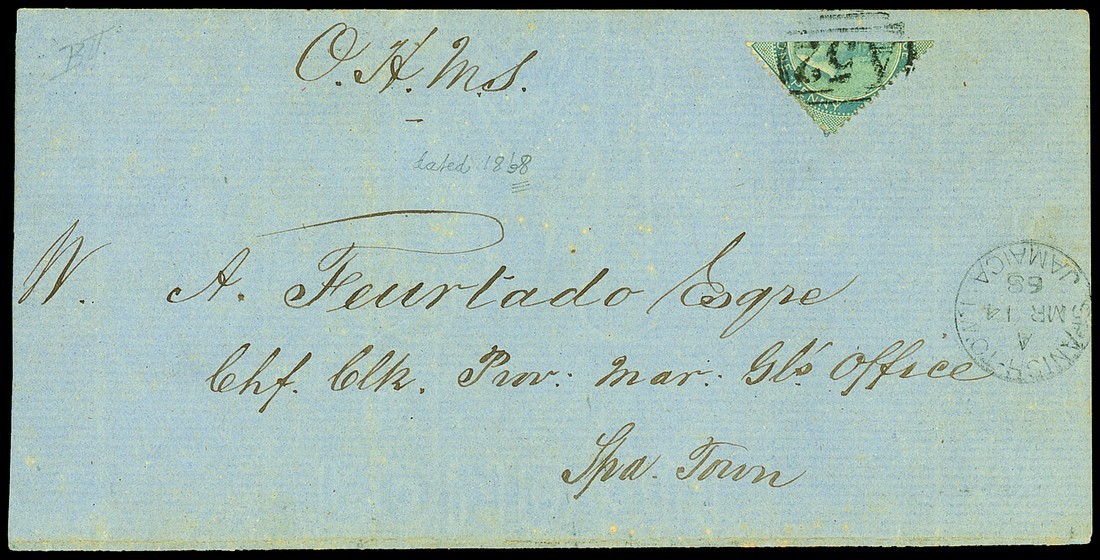 1868 (14 Mar.) "O.H.M.S." wrapper from Manchioneal to Spanish Town, bearing 1d. 1d. blue (faults) bisected diagonally and neatly cancelled "A52". arrival c.d.s. (14.3) below, Mandeville transit c.d.s. (13.3) on reverse. S.G. 1d, £650. Photo