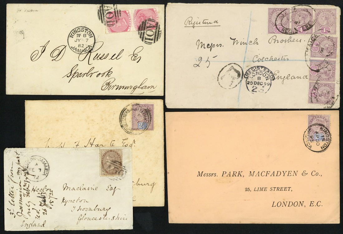 1872 envelope from Malvern to England bearing 1/- cancelled A56", 1882 envelope from Kingston to England bearing 1d. pair cancelled "A01", 1895 envelope from Kingston to London bearing 2½d. with c.d.s., 1895 ½d. card from Falmouth via Montego Bay to Mile Gully, 1898 envelope to Natal bearing 2½d. with Kingston Street Letter Box c.d.s. and 1899 envelope from Kingston to England bearing 1d. (6) with oval registered datestamps