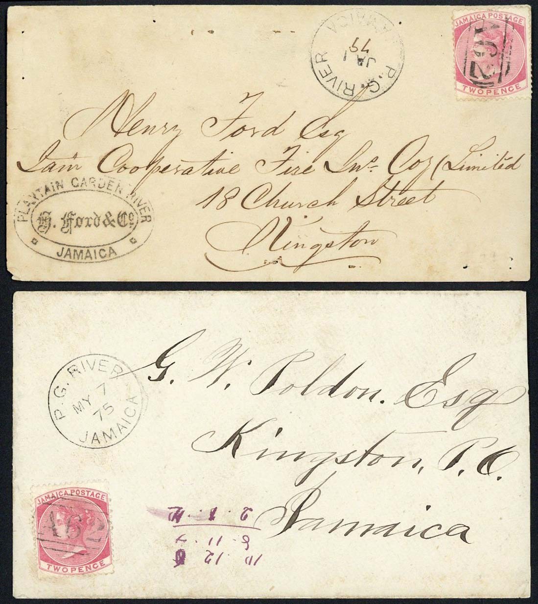 1875 and 1879 envelopes from Plantain Garden River to Kingston, both bearing 2d. rose cancelled "A62" and with "p.g. river/jamaica" c.d.s. alongside, the first dated 7 May (the earliest recorded example of this c.d.s.), the other dated 1 January with the year date unusually written in manuscript, arrival c.d.s. on reverse; a fine pair of covers from this scarce office