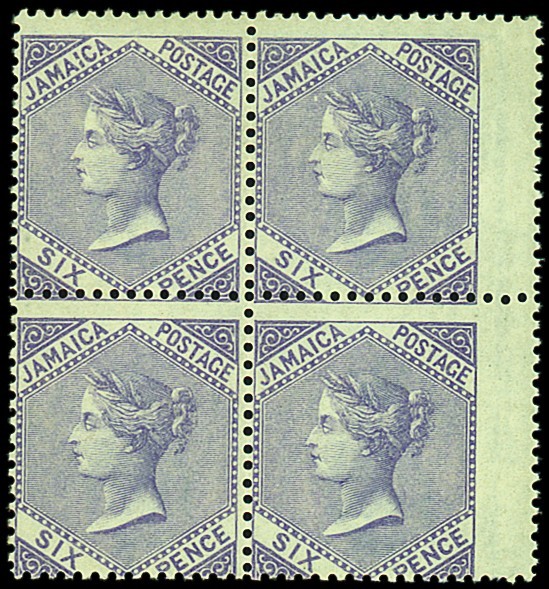 1860-70 6d. dull lilac block of four with wing-margin at right, good colour, fine unused with large part original gum. S.G. 5, £720. Photo