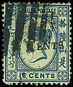 — 2c. on 16c. blue, a little heavily cancelled by oval of bars, fine. S.G. 24, £900. Photo