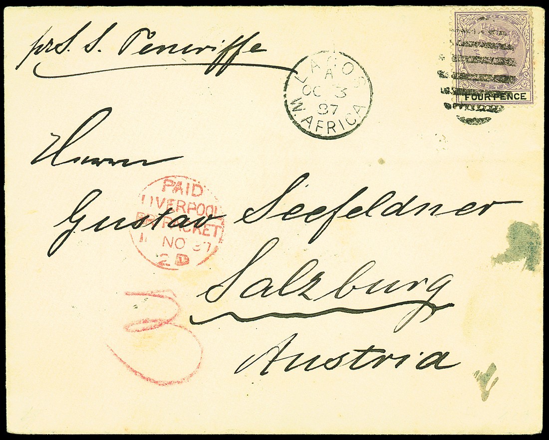 1887 (3 Oct.) envelope "per S.S. Teneriffe" to Austria, "3" accountancy mark in red crayon and bearing 1887-1902 4d. dull mauve and lack cancelled with oval of bars showing despatch c.d.s. and Paid Liverpool Br. Packet c.d.s. (1.11), Salzburg arrival c.d.s. (3.11) on reverse. S.G. 33. Photo
