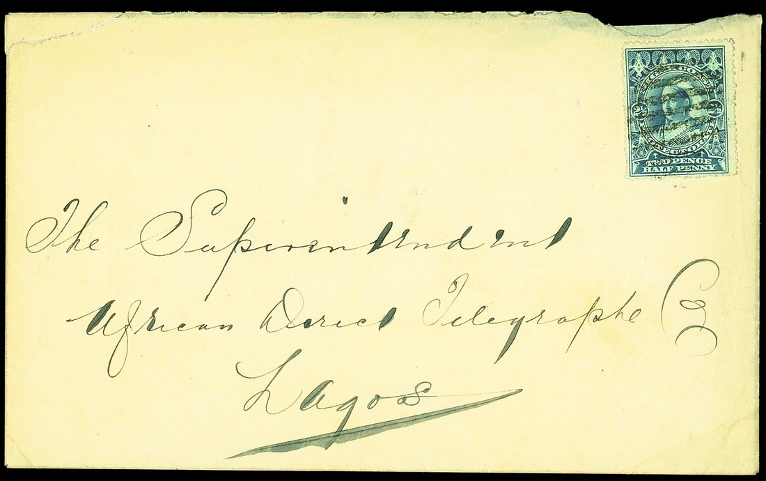 1898 (Aug.) envelope (small faults at top through opening) to "The Superintendent of the African Direct Telegraph Co. Lagos", bearing Niger Coast 1894 2½d. blue cancelled with oval of ten bars, Lagos c.d.s. (15.8) on reverse. S.G. 54. Photo