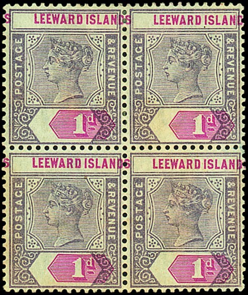 1890 1d. dull mauve and rose, variety name and value tablet misplaced 3mm. to the right resulting in the country name reading "s leeward island", a block of four with large part toned original gum; fine. A rare and striking variety. One of only two known blocks of four among the 27 known examples of this variety. S.G. 4 var. Photo