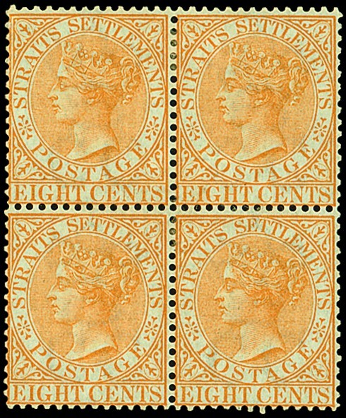 — 8c. orange block of four, unused with part original gum, all with hinge remnants or marks and the upper pair with a slight thin. S.G. 14a, £900. Photo