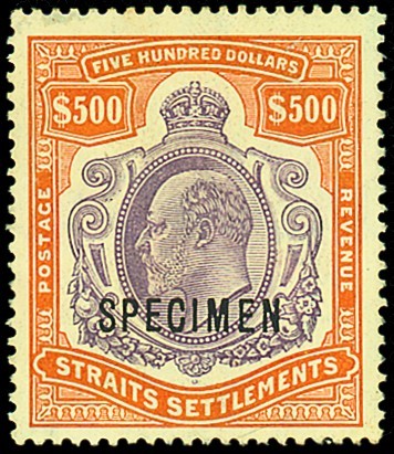 — $500 purple and orange, overprinted "specimen", gum sweated though of fine appearance. S.G. 169s, £4,000. Photo