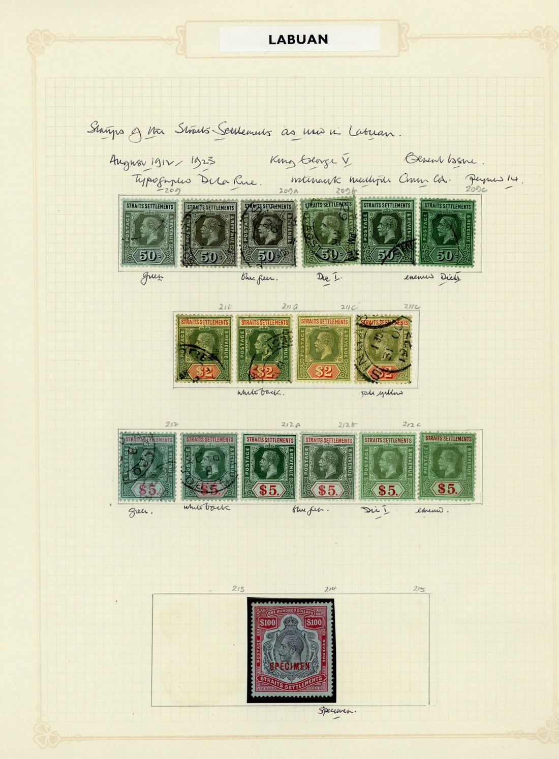 1912-41 mint collection including 1912-23 1c. to $5 with many additional shades/papers plus $100 overprinted "specimen" (small thin and some gum stains), 1921-33 Script 1c. to $5 with additional dies and shades, 1936-37 1c. to $5 and 1937-41 1c. to $5, mostly fine; also a few used. Cat. £2,000+