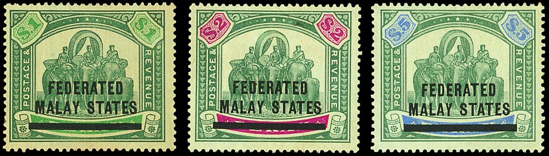 — Perak $1 (two small thins at top), $2 (small thin and tone spot on reverse) and $5 (fine), mounted mint. S.G. 11-13, £850. Photo for $5