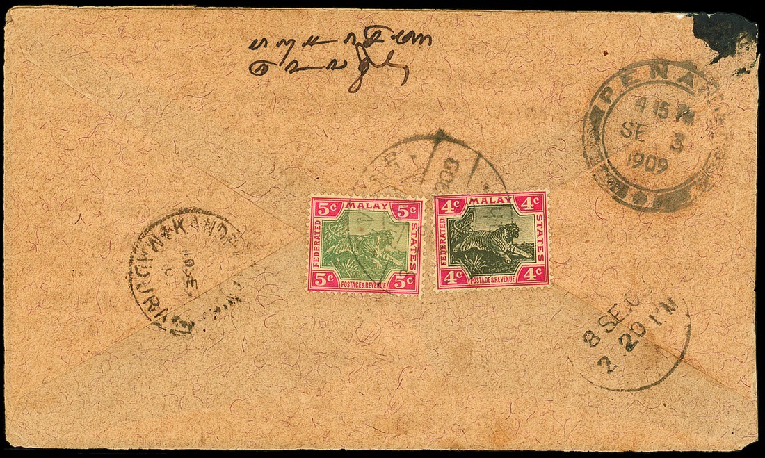 1909 (3 Sept.) envelope to India bearing, on reverse, Federated Malay States 4c. and 5c. tied by bi-lingual "Kedah" c.d.s. with Penang transit d.s. (3.9) alongside and showing another strike of the bi-lingual d.s. on face; the envelope with front and back panels separated. A rare rate having only been in used between July and September 1909. Less than ten covers recorded. Photo
