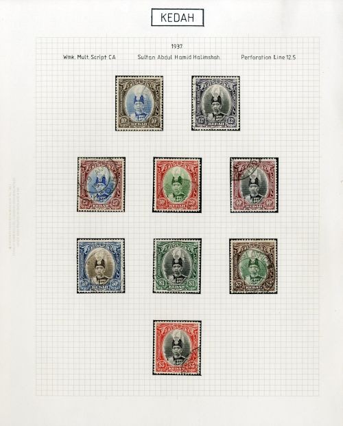 1922 Exhibition "borneo" 14mm. long 1c. to 50c. set of eight, 1937 10c. to $5, 1948 Silver Wedding set, 1949 UPU, 1950-55 1c. to $5 with some shades, used, chiefly fine. Also 9121 envelope from Jitra to England franked at 6c. with c.d.s. in blue