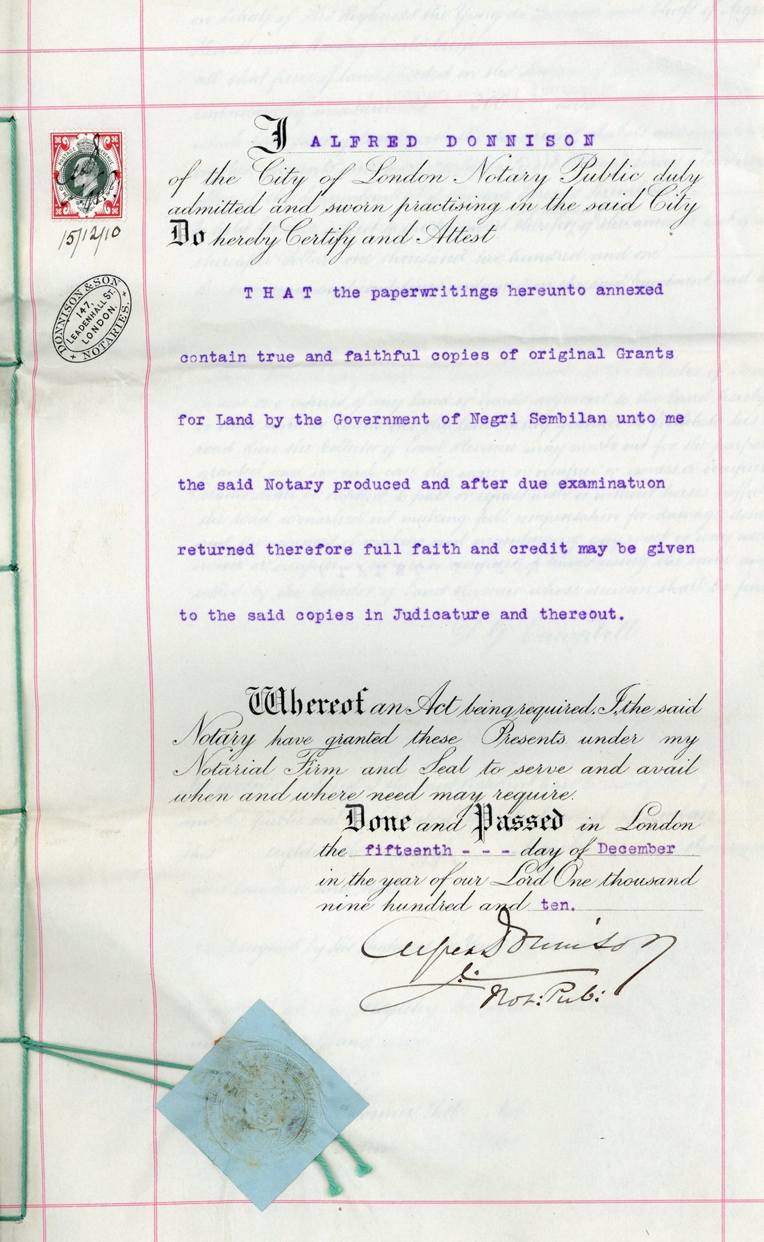 1909-10 Grant for Land, Register of Titles for the District of Tampin, a group of four Grants between the Government of Negri Sembilan and other parties, each with a detailed coloured plan of each plot of land and with City of London Notaries report bearing K.E.VII 1/- used as a revenue stamp. Fine and interesting