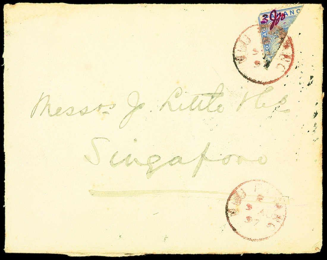 1897 (Aug.) 3c. on half of 5c. blue, bisected diagonally, tied by red "ulu pahang" c.d.s. on 1897 (9 Aug.) front to Singapore; the bisect with slightly rounded top left corner and the front with vertical crease and some light staining at edges. Photo