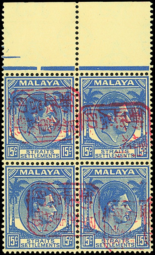 15c. ultramarine block of four with margin at top, variety handstamps sideways, fine unmounted mint. ISC J5b, unpriced. Photo