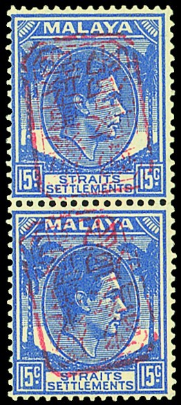 15c. ultramarine vertical pair, variety handstamp inverted, fine mint. ISC J5c, unpriced. Photo