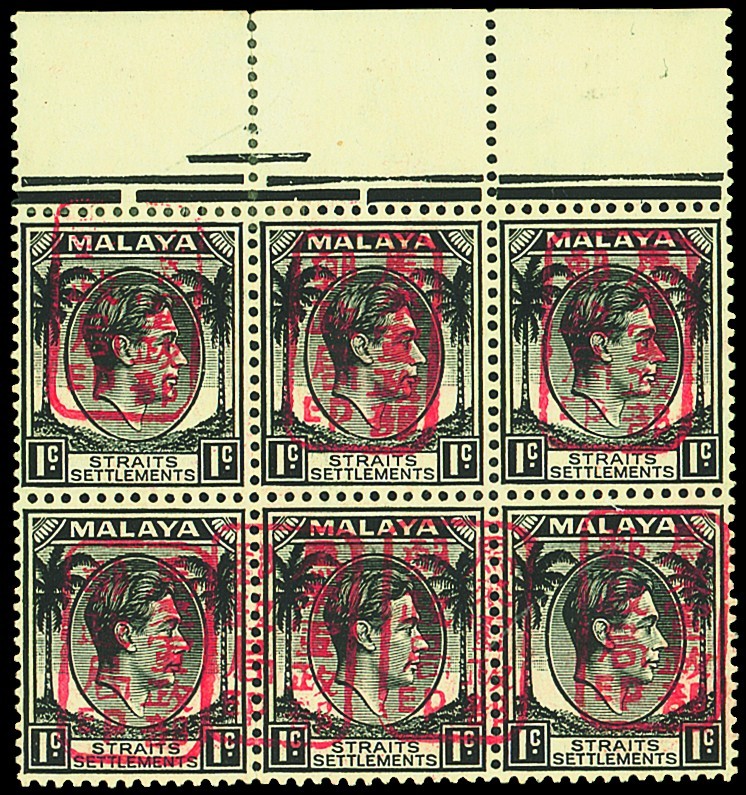 1c. black marginal block of six (3x2) with chop in red (Type A), the centre stamp in the lower row showing variety handstamp double, fine mint. Very scarce. ISC J13e, $4000+. Photo