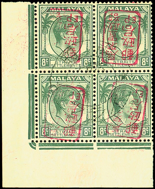 8c. grey lower left corner block of four with chop in red (Type B), variety handstamp inverted, fine and lightly cancelled. ISC J18d, unpriced. Photo