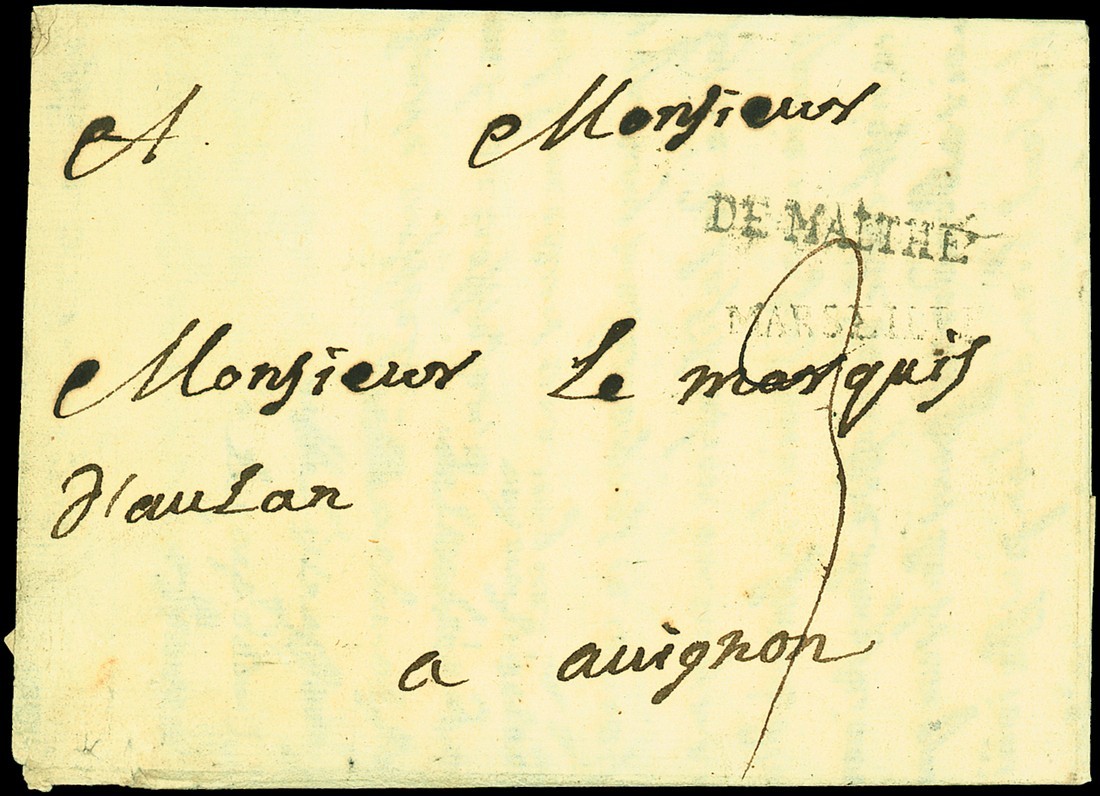 1758 large part entire letter to Le Marquis d'au San at Avignon, rated "3" and showing good to fine and fine strikes of "marseille" and "de malthe" handstamps struck separately (M+DM). A rare and early date of use. Photo