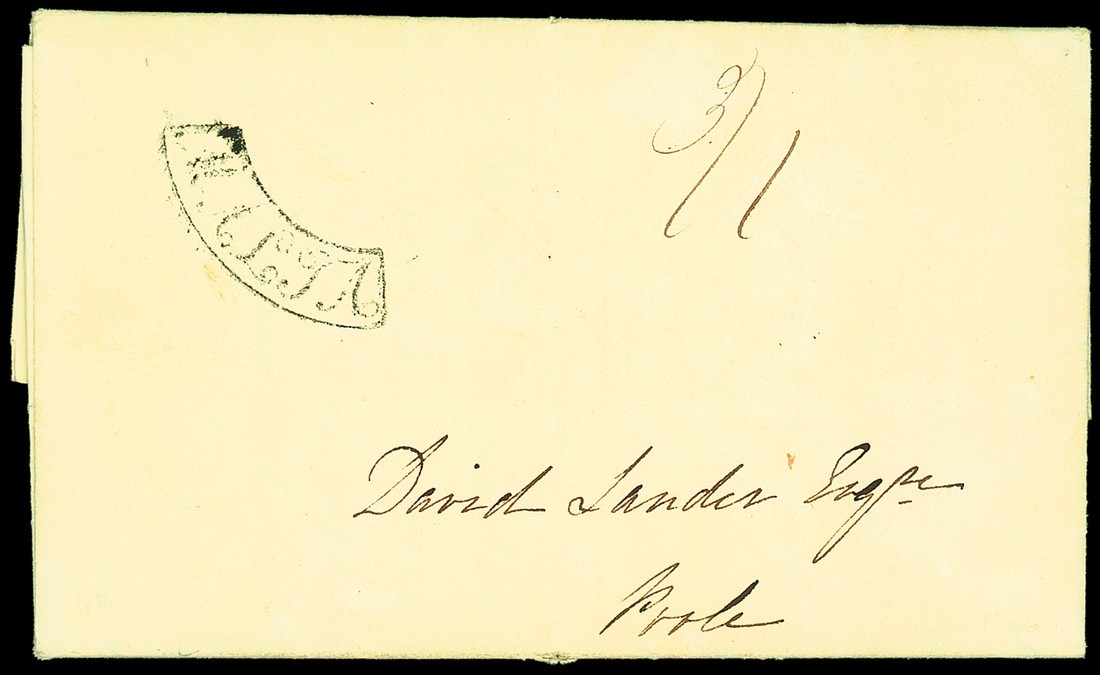 1836 (17 Nov.) entire letter to Poole, rated "3/1", showing mainly fine strike of curved framed "malta" (MSF-1c); no other postal markings. Photo