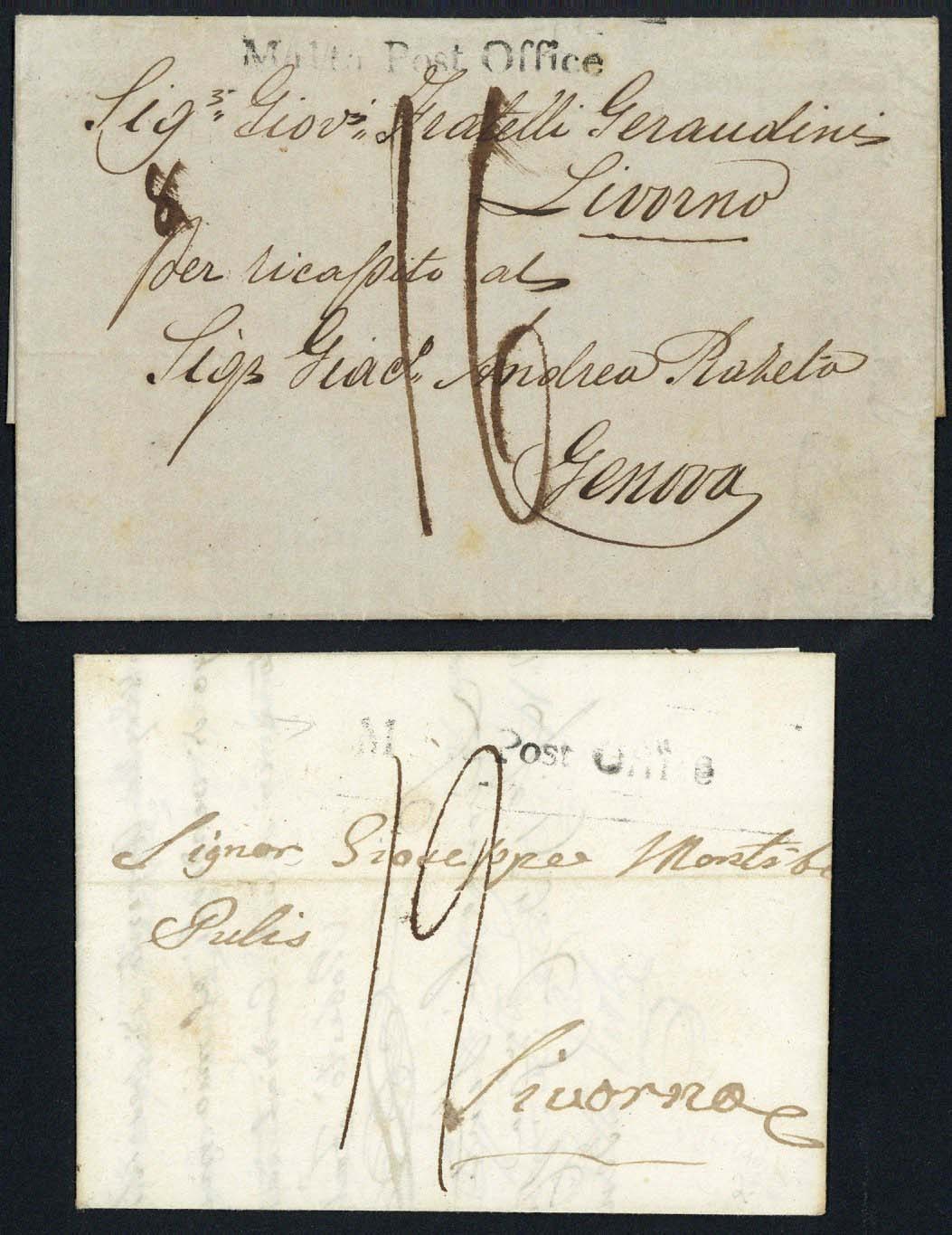 1840 (25 Feb.) entire letter to Genoa, rated "8" and "16", showing fair to fine strike of "Malta Post Office" h.s. (MPO-1a) with arrival d.s. on reverse; also 1839 (6 Apr.) entire letter to Livorno, rated "19" showing poor strike of similar h.s.