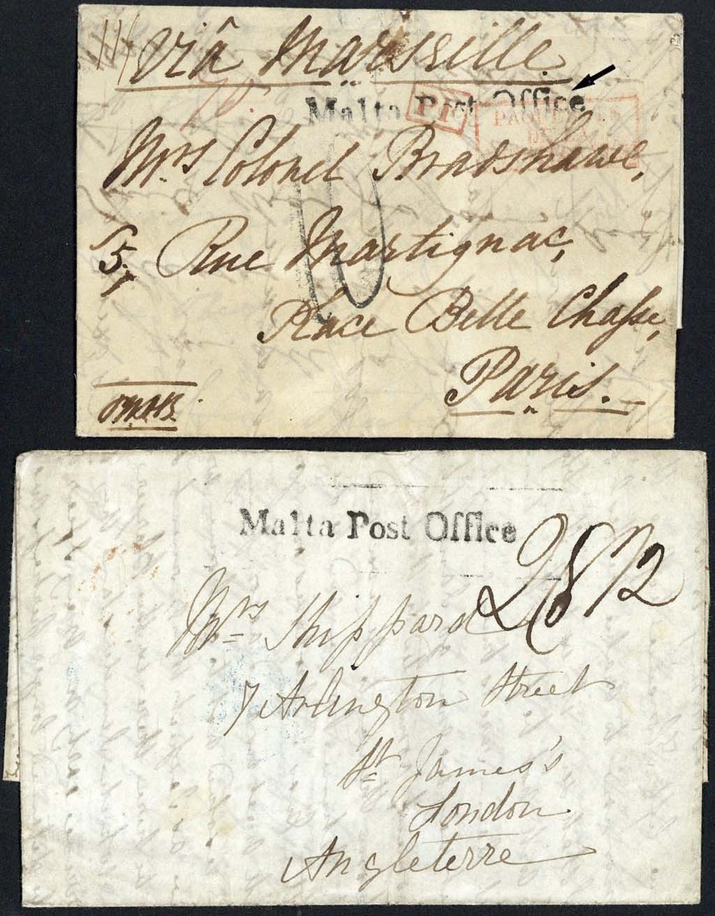 1840 (15 Mar.) entire letter to Paris, marked "Via Marseille", rated "70" in red ink, showing good to fine strike of "Malta Post Office" (MPO-1a) overstruck by framed "pf" and "paquebots/de la/mediteranée", both in red and handstruck "10" (decimes); and 1840 (5 Apr.) entire letter to London, rated "2/8½" and showing fine strike of "Malta Post Office" (MPO-1a) with arrival datestamp on reverse
