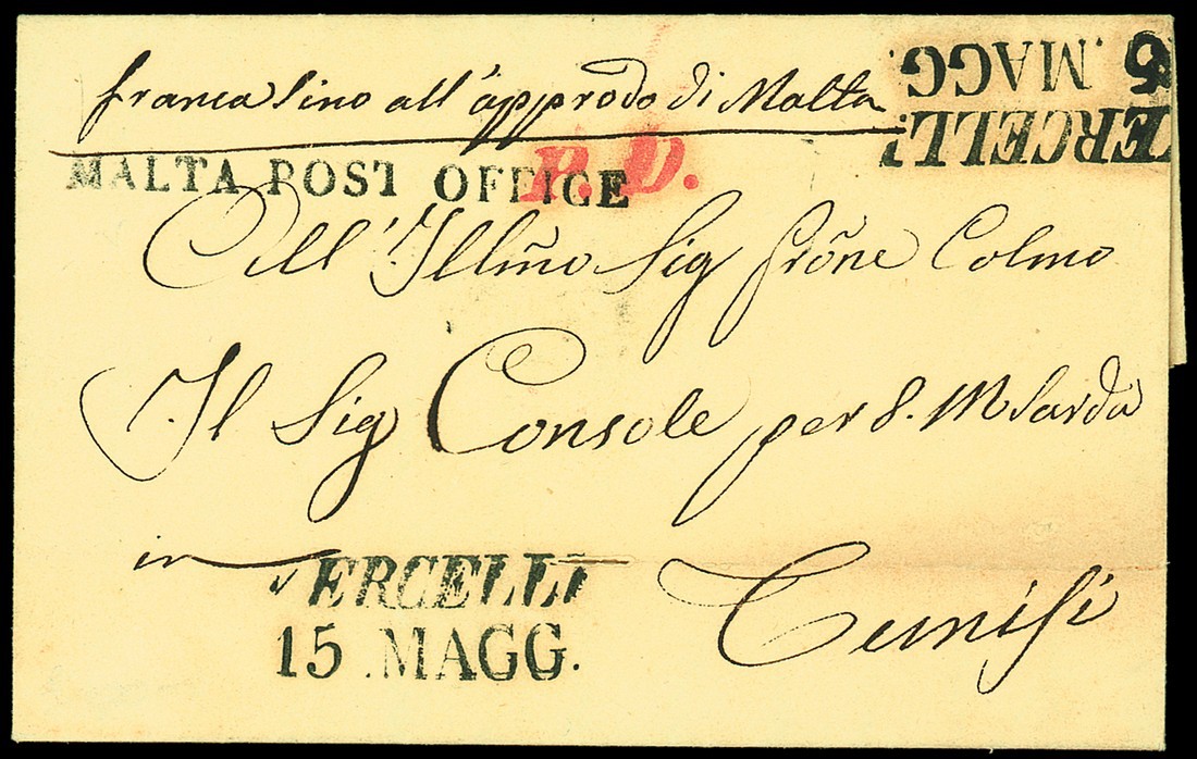 1849 (19 May) entire letter to Italy, showing very fine "malta post office" (MPO-2d) partly overstruck by unframed "p.d." in red, two strikes of Ercelli d.s. and, on reverse, Livorno datestamp. Photo