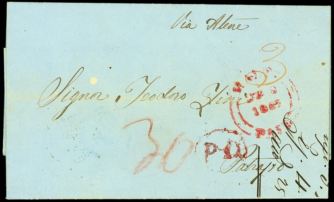 1857 (8 Dec.) entire letter to Patras, rated "3" and "30" in red, showing a good strike of "malta/paid" double-arc d.s. in red (MPC-1bR), oval-framed "p-d" and, on reverse, Greek transit and arrival datestamps; also 1851 (Nov.) envelope to London showing fair strike of the Malta double-arc d.s. Photo for first