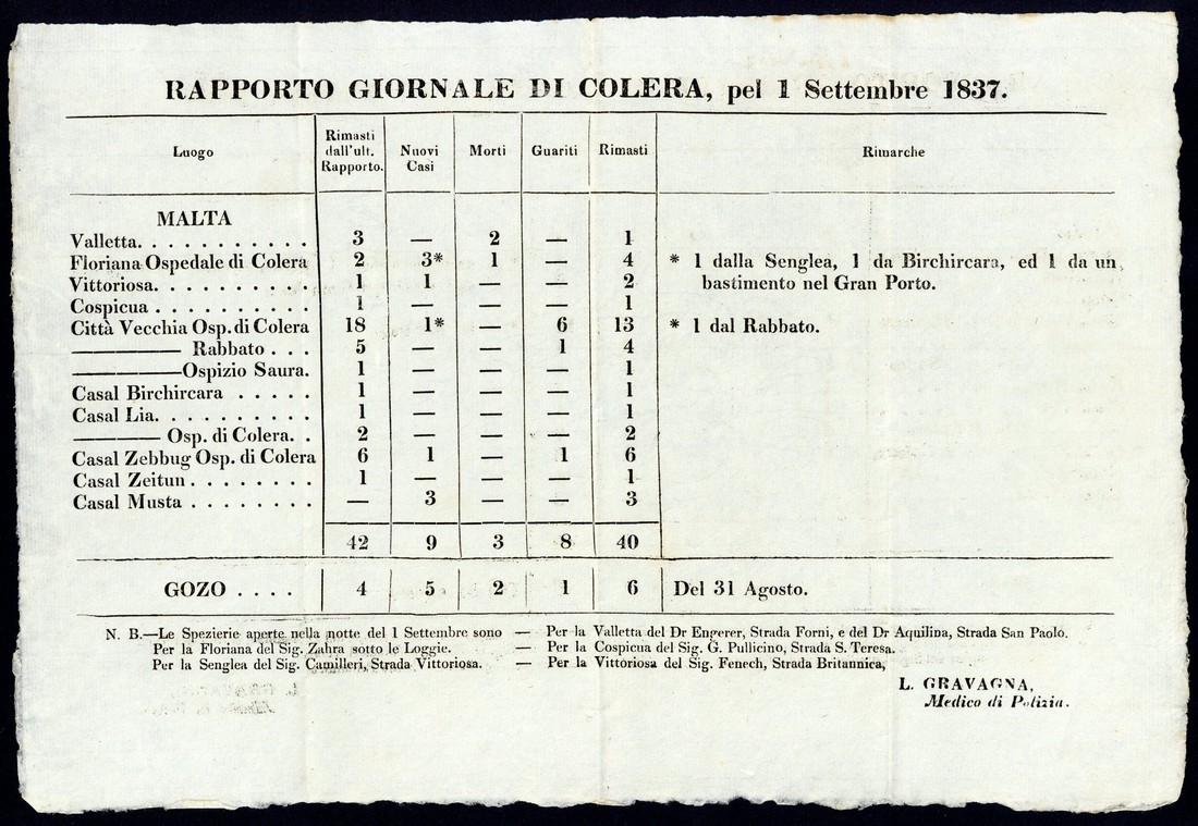"rapporto giornale di cholera" (4) dated 11th, 28th and 30th August and 1st September 1837, all with folds and two with some light foxing, otherwise fine