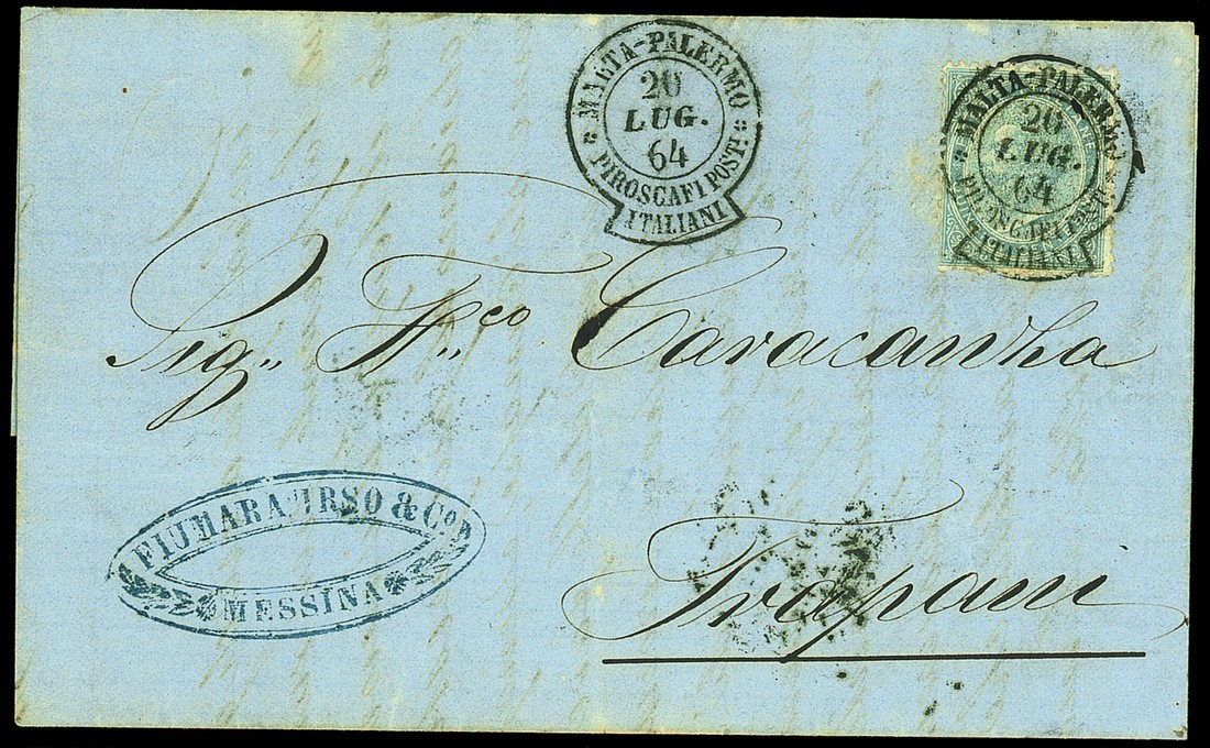 1864 (19 July) entire letter from Messina to Trapani, bearing Italy 15c. tied by very fine "malta-palermo/piroscafi postali/italiani" keyhole datestamp (PMK-1) with another fine strike alongside and showing, on reverse, Palermo and arrival datestamps. Rare. Photo