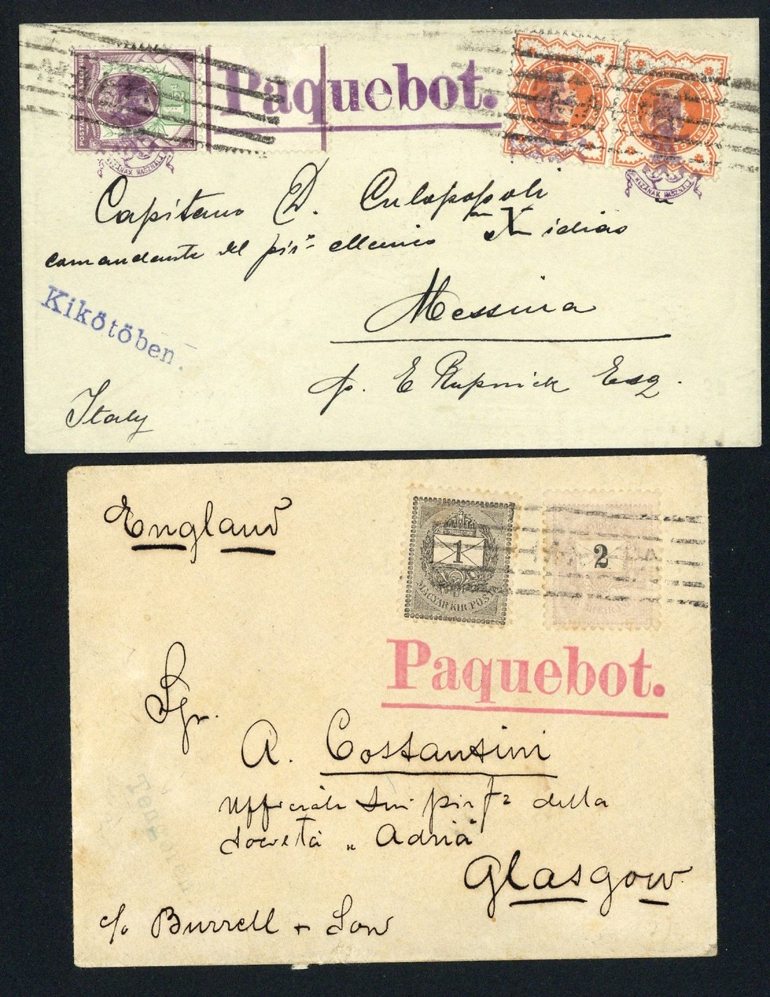 1898 (8 Sept.) envelope to Glasgow, bearing Hungary 1k. and 2k. tied by "malta" in bars, showing "Paquebot." h.s. in red (PAQ-A1) and "Tengeren" h.s. in green with Valletta d.s. on reverse; 1899 (20 Sept.) envelope to Messina, bearing GB ½d. pair and 1½d. each cancelled by ADRIA-3 h.s. and "malta" in bars, showing "Paquebot." h.s. in violet (PAQ-A1) and "Kikötöben." h.s. in blue with despatch and arrival datestamps on reverse